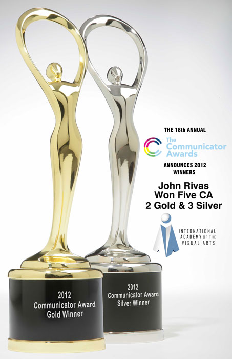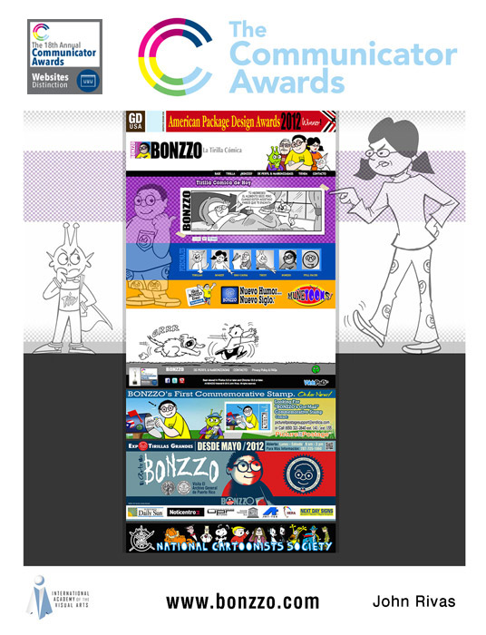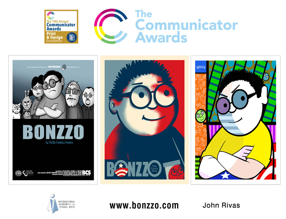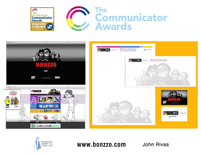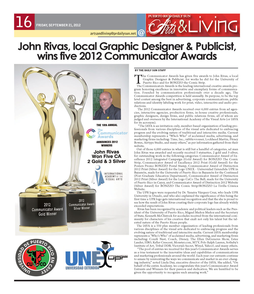 Out of those 6,000 entries John Rivas Publicidad was awarded and recently received 5 statuettes, 2 gold and 3 silver, for outstanding work in the following categories: Communicator Award of Excellence 2012 Integrated Campaign (Gold Award) for BONZZO The Comic Strip, Communicator Award of Excellence 2012 Print (Gold Award) for the Posters Promo BONZZO Postal Stamp, Communicator Award of Distinction 2012 Print (Silver Award) for the Logo UNEX - Universidad Extendida UPR in Bayamón, made for the University of Puerto Rico in Bayamón for the Continued (Post-Graduate Education Department), Communicator Award of Distinction 2012 Print (Silver Award) for the Logo CuCo The Bull, made for the University of Puerto Rico in Cayey, and Communicator Award of Distinction 2012 Website (Silver Award) for BONZZO The Comic Strip/BONZZO La Tirilla Cómica Website.